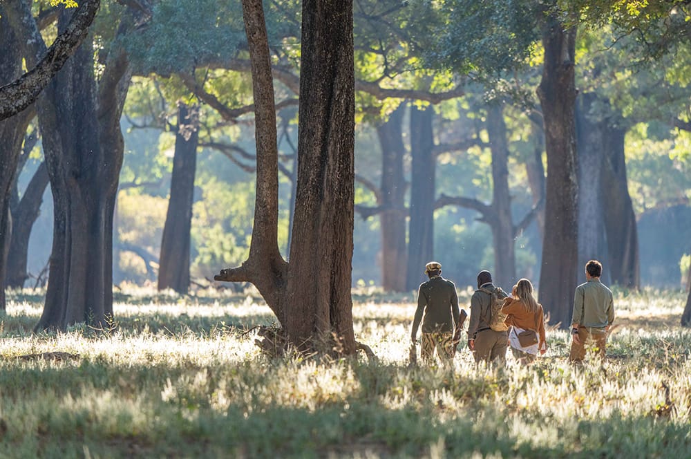 On foot, you head out from your lush camp at dawn, with a pair of guides (they are armed with rifles, just in case, as per Zambian rules). They know the bush so well that recognizing every smell, sound, and spoor (track or scent of an animal) is second nature for them. There is something about having your feet in the dirt and your eyes glued to the paths and foliage that allows for a more intimate experience. Walking, as an alternative to the game drives in a Land Rover, has an essence of nature and an ability to remove distractions, placing you right alongside the animals.
