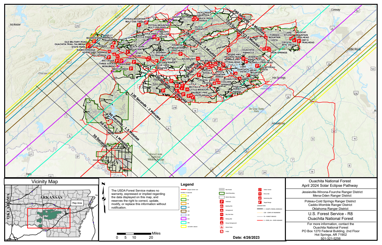 The national forests and grasslands in the area of totality will be open and expect thousands, even tens of thousands, of possible visitors. In fact, the Ozark-St. Francis National Forests are headquartered in Russellville, Arkansas, where NASA will be hosting its live broadcast of the eclipse. As a result, Russellville alone is expecting more than 100,000 visitors.